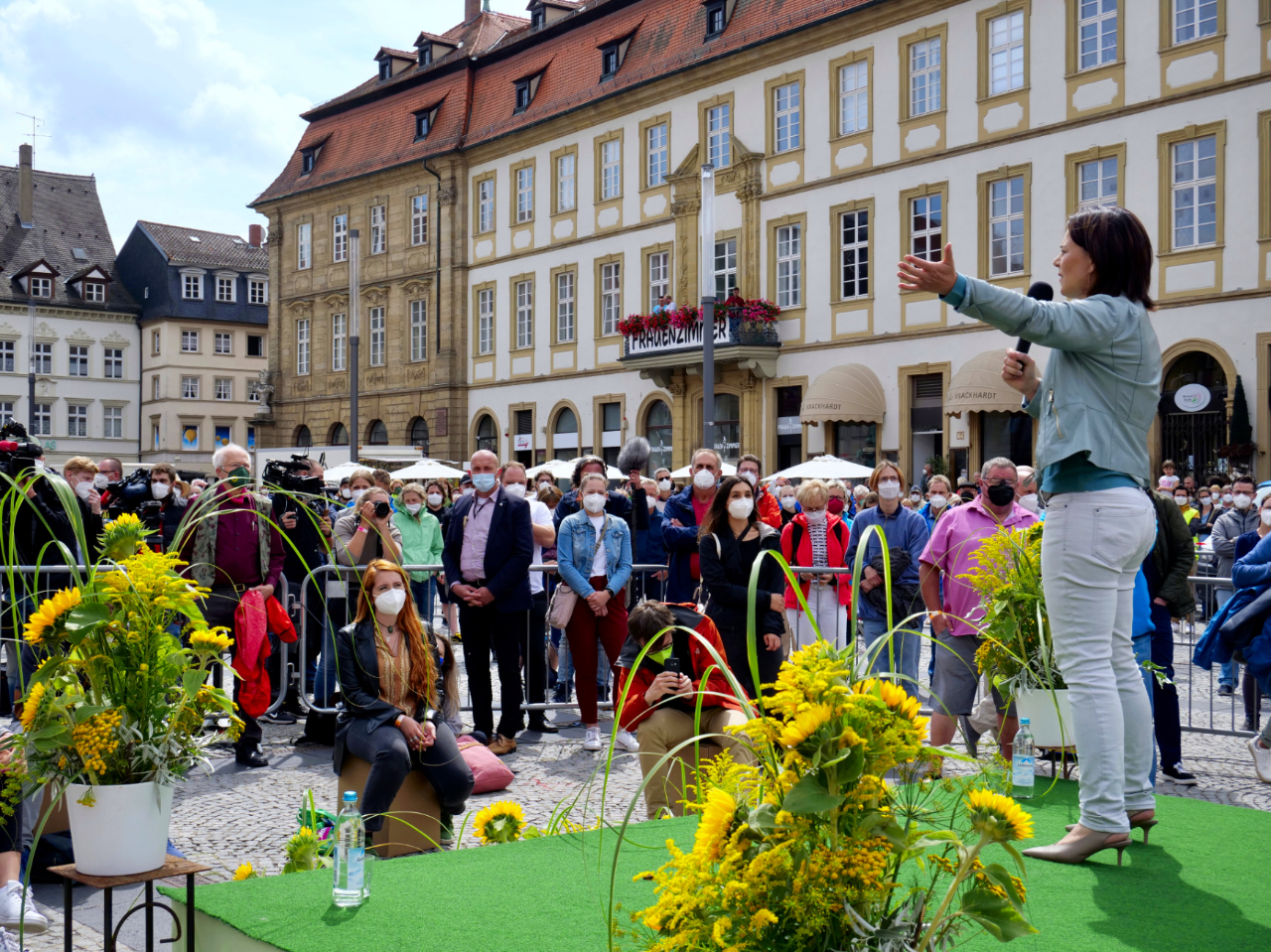 Am 17. August 2021 besuchte Annalena Baerbock auf ihrer Wahlkampftour unter dem Motto „Bereits, weil Ihr es seid“ Bamberg. Viele hundert Menschen aus der Stadt und ganz Oberfranken – deutlich mehr als erwartet – hatte sich gegen Mittag auf dem Maxplatz im Zentrum der Altstadt eingefunden, um die Bundesvorsitzende und Kanzlerkandidatin von BÜNDNIS 90/DIE GRÜNEN persönlich zu erleben. Das große Interesse der Öffentlichkeit und der immer wieder aufkommende laute Applaus während der Rede von Annalena Baerbock beweist den großen Zuspruch der Menschen in der Region für einen Politikwechsel bei der Bundestagswahl mit den GRÜNEN.