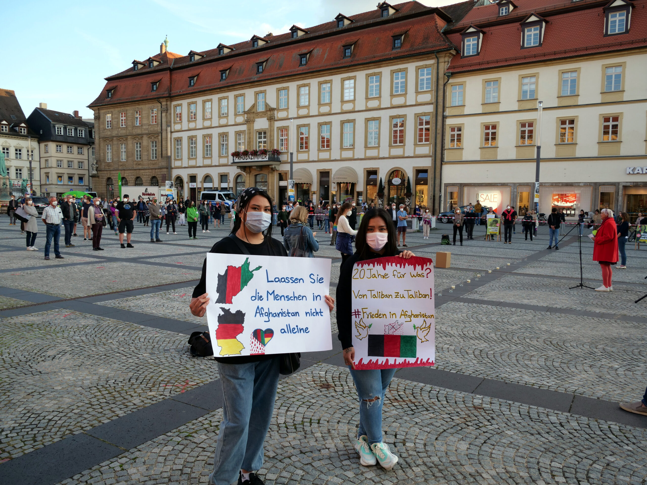 Anlässlich des Anti-Kriegs-Tages am 1. September setzten die Bundestagsvizepräsidentin Claudia Roth und Lisa Badum MdB zusammen mit vielen Menschen in Bamberg auf dem Maxplatz ein Zeichen für die Menschen in Afghanistan.