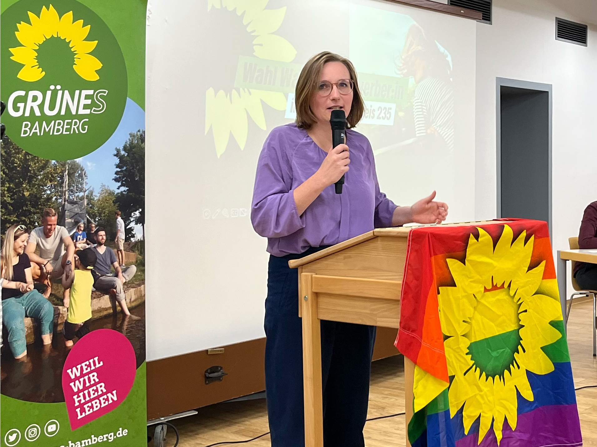 Die gebürtige Forchheimerin Badum vertritt den Wahlkreis bereits seit 2017 im Bundestag. In ihrer kämpferischen Bewerbungsrede sprach die Grüne Bundestagsabgeordnete von wichtigen grünen Erfolgen in der Regierung, wie dem Rekordtempo beim Ausbau der Erneuerbaren Energien, mehr Geld für die Schiene und gesellschaftlicher Liberalisierung. „Es gibt trotz der Erfolge immer noch sehr große Probleme. Die lösen wir aber nur, wenn wir das Land nicht den Pessimisten und Nein-Sagern ausliefern. Wir gehen nicht zurück!“, so Badum.
